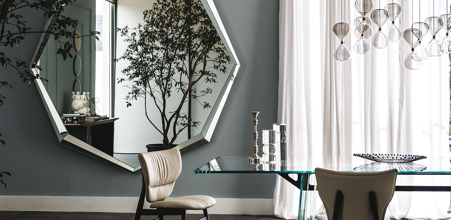 Cattelan Italia Emerald is a family of designer mirrors with a fully mirrored frame. With their sharp-cornered shape and three-dimensional frame, these mirrors are like precious stones, and as such, they reflect different views of the surrounding room. The large Emerald contemporary wall mirror is designed to decorate a wall while simultaneously expanding the room. Emerald is available in round or rectangular shapes or in the 2-metre-large Emerald Magnum version. To give the room a more intimate and sophisticated effect, Emerald can have a fumé glass mirror.