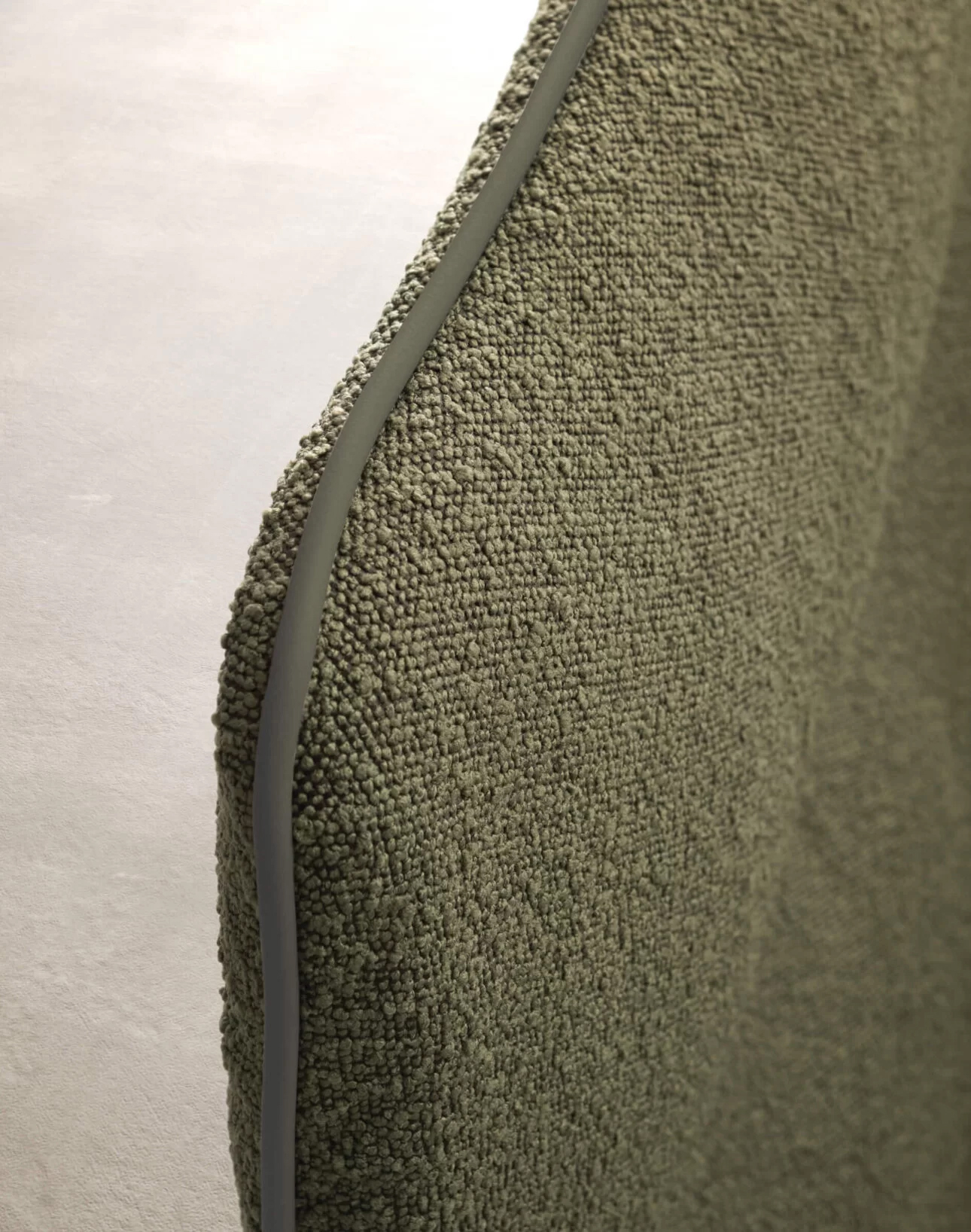 Presotto Dolly Rose Bed with soft and elegant shapes, characterised by an impressive upholstered fabric headboard which, protruding at the sides from the bed base, recalls a modern boiserie. The bed frame crafted from beech and poplar wood can be upholstered in fabric or leather.