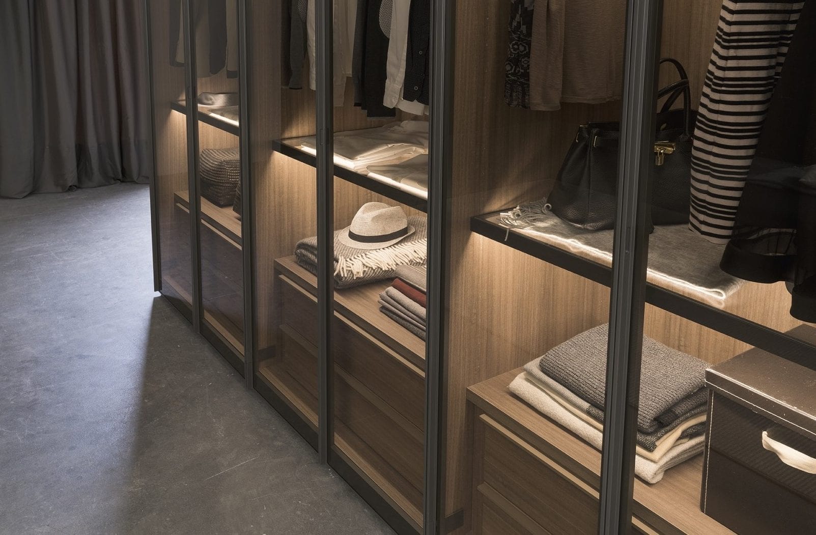 Swing door wardrobe featuring doors with a glass panel available in clear, grey or bronze glass and master carre glass. The door also features a Grigio Londra finish aluminium frame with a full- length handle integrated into the frame. The door is fitted of soft closing hinges integrated into the frame.