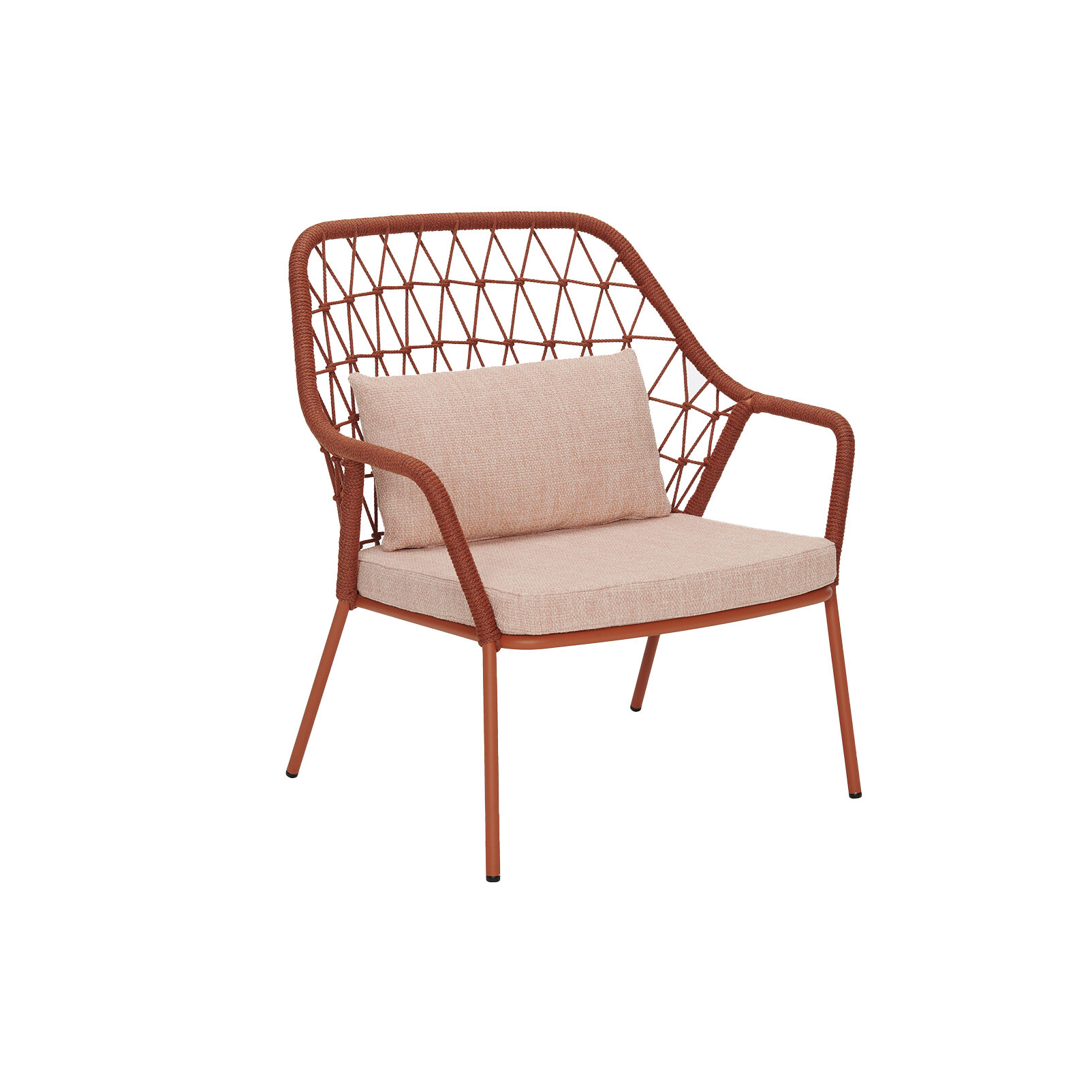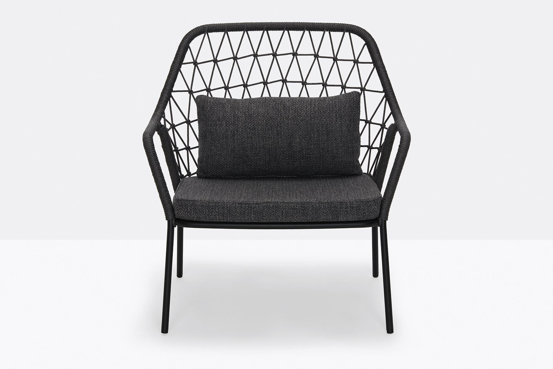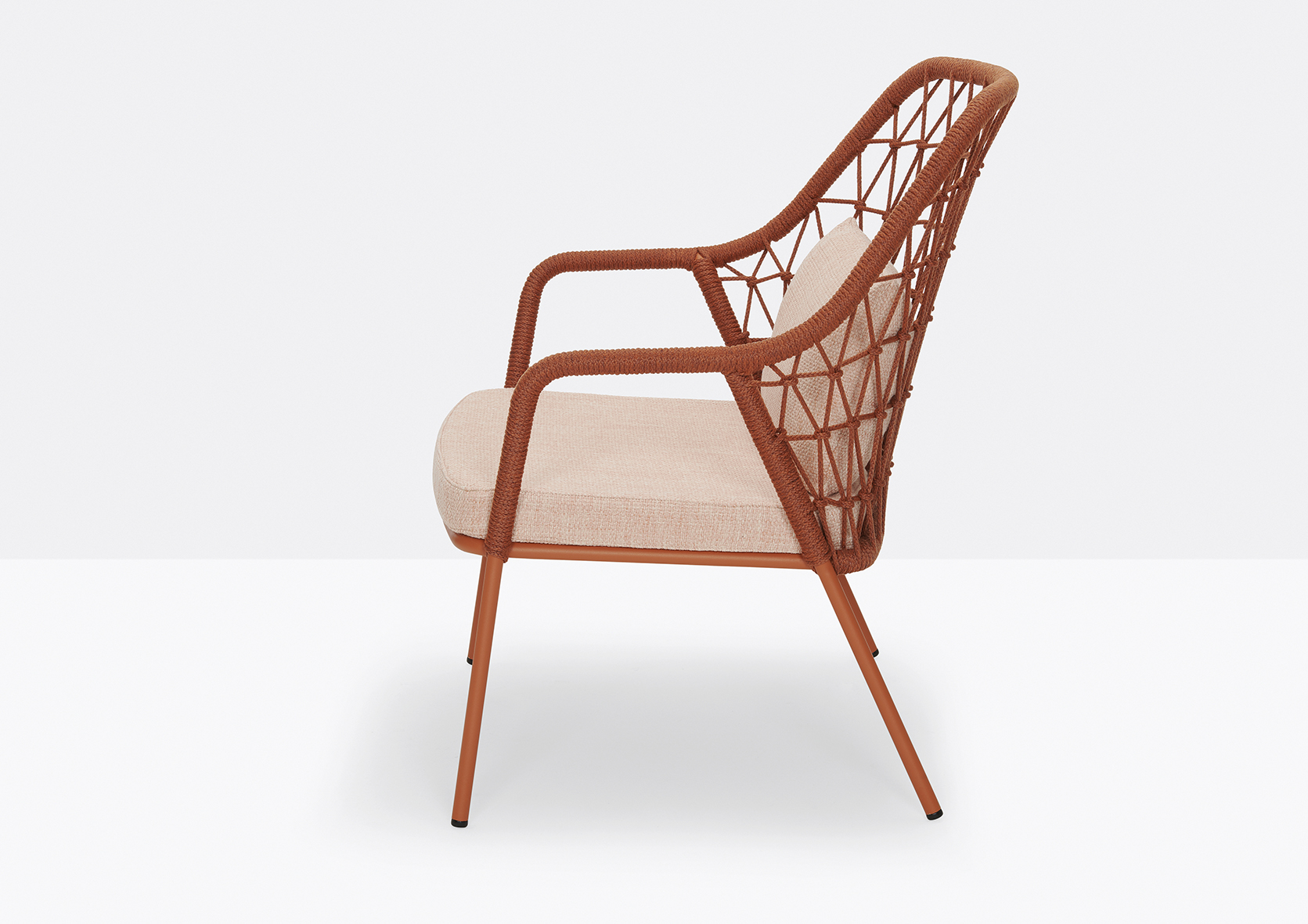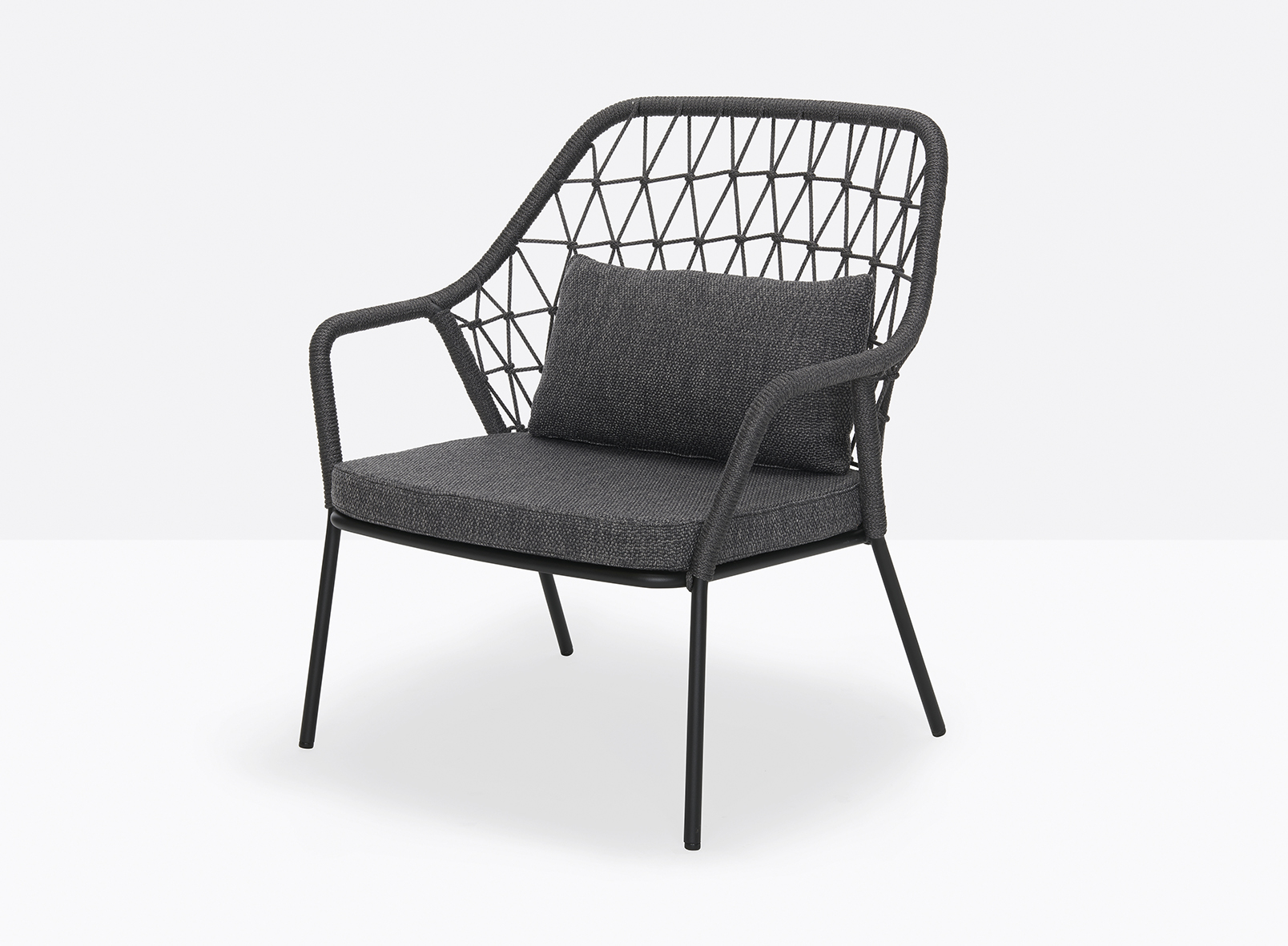 The idea behind Pedrali Panarea is rooted in the Mediterranean coastline, and in the colours and refreshing breeze of an outdoor dinner on a sea-facing terrace. A lounge armchair featuring a traditional element in polypropylene cord hand-woven in Italy that wraps around the Ø 20 mm steel tube frame. Seat cushion in dry-feel polyurethane foam, covered in fabric made from the same yarn used for the woven element.