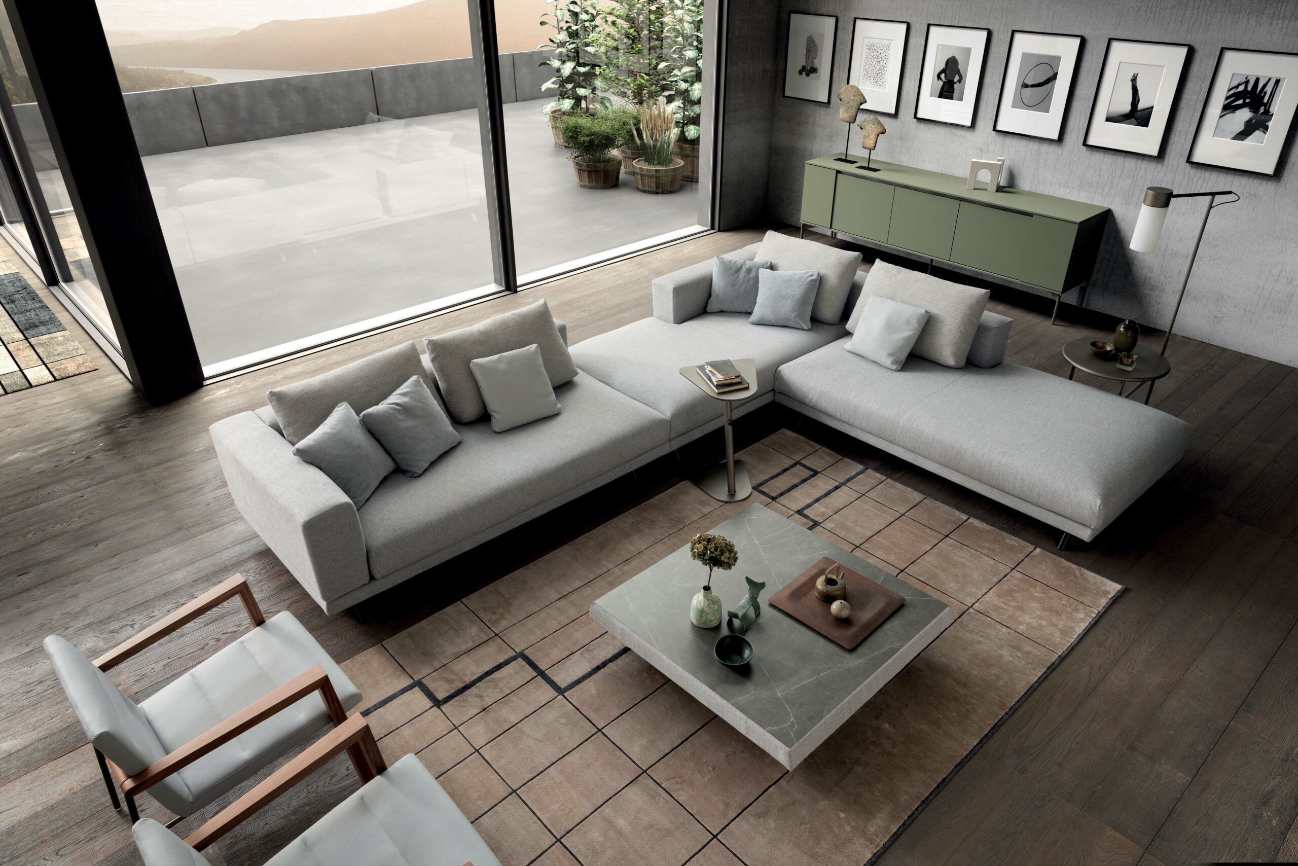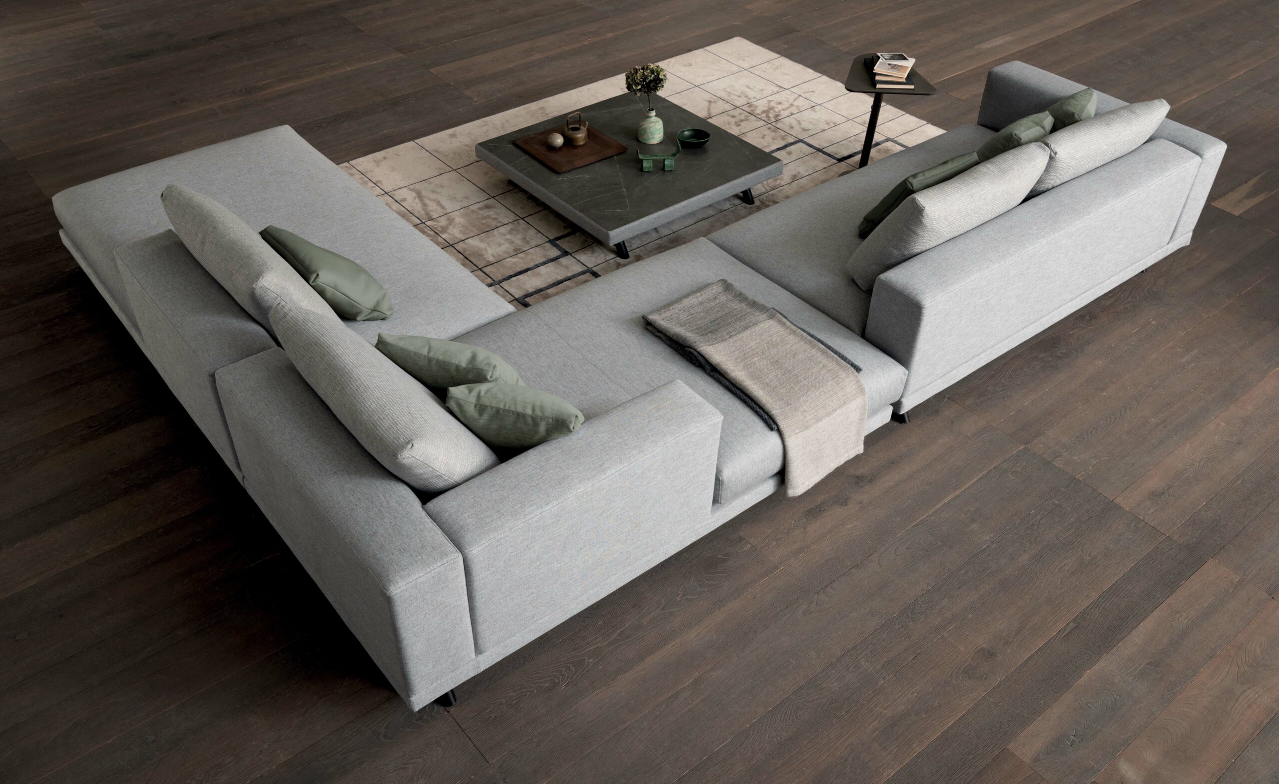Presotto San Marino Sofa is upholstered in fabric and available as a sectional sofa or interrupted by side tables, pouf in an open and closed interplay.