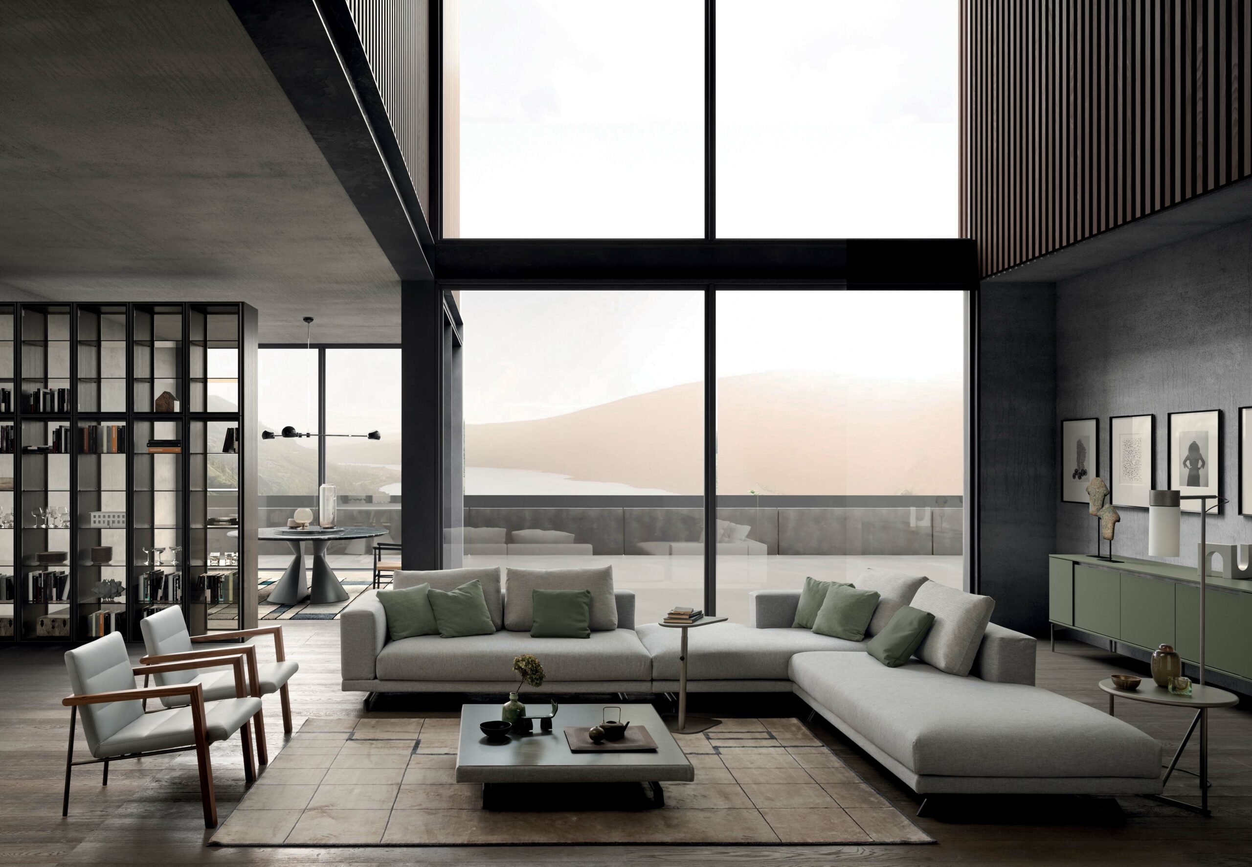 (Photo: San Marino in grey ALLURE PLAIN fabric and decorative cushions in green velvet FOX).