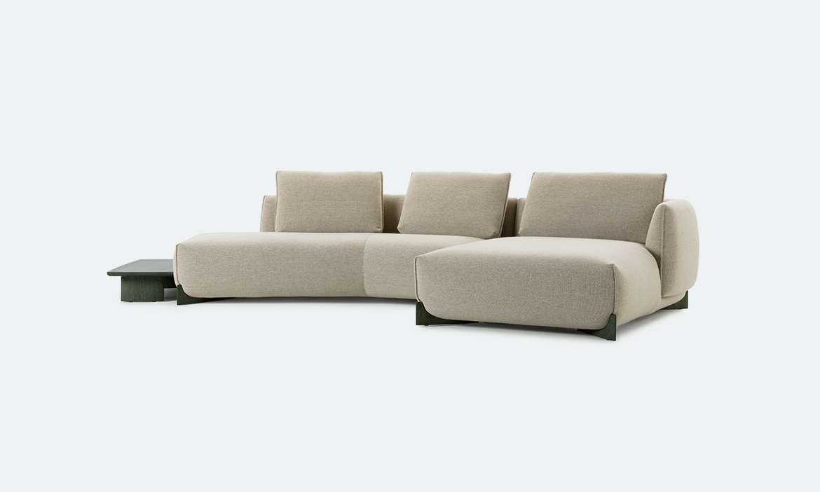 Leolux Naila sofa programme offers various sofas and modular elements, such as a 90-degree angle and a buckled (asymmetrical) element. For the end element with the footstool, special (add-on) tables have been developed that perfectly fit the contours of the footstool. Striking features of this model are the details in the finish, the large leather or fabric sections and the elliptical legs in solid oak (or lacquered aluminium).