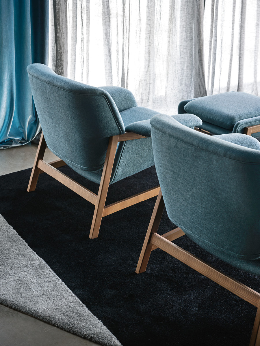 Agnese is a faithful reissue of the Gianfranco Frattini design, nominated for a Compasso d’Oro in 1956. The armchair is painstakingly true to the original design, right down to details such as the hand-sewn stitching on the armrests. It features a light frame in ash wood, which elegantly supports the backrest and the seat with its armrests and cushion. A matching pouf is also available, again produced to Frattini’s original design.