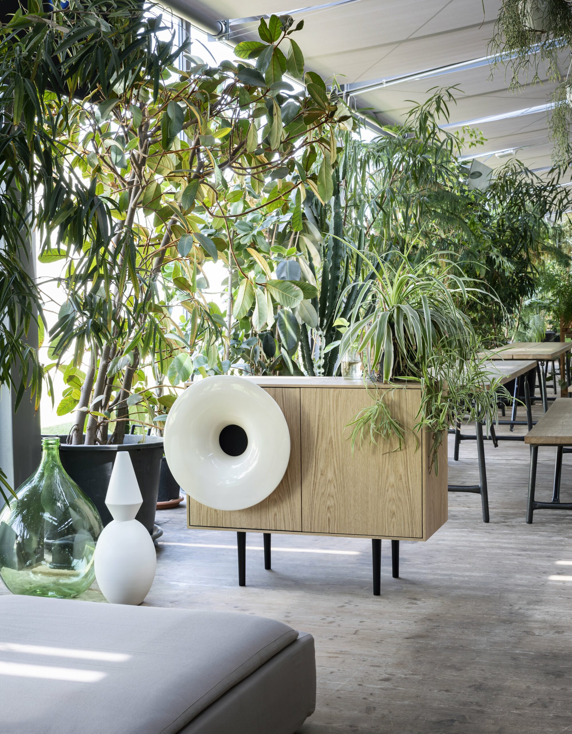 Caruso invites you to sit down, take a break, and find again the magic to hear and see an object that plays good music. It stands on the edge of irony, a little futuristic, a little nostalgic, managing to combine hi-tech to the living for a multi-sensory décor.