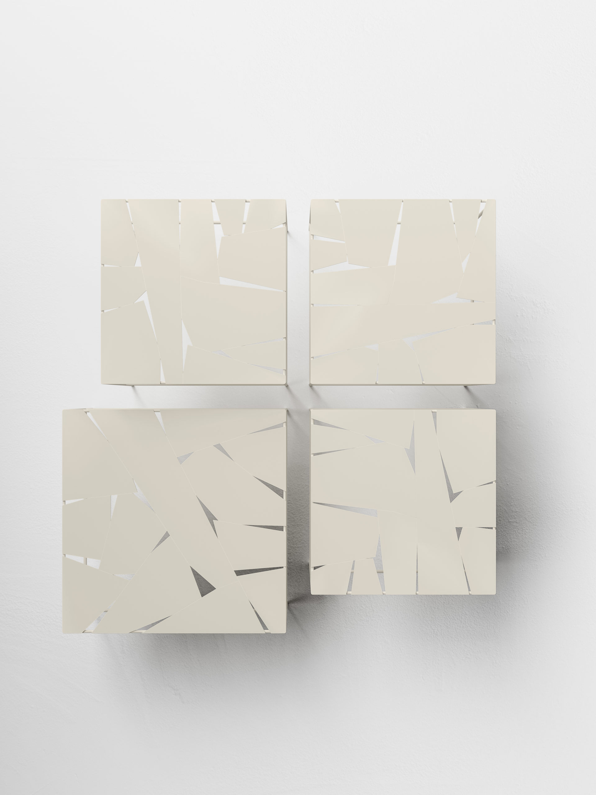 The top of the Borgo coffee table is a thin sheet of steel with precise cuts taken out of it. Its irregular shapes are inspired by a landscape artwork called the Cretto di Burri, which uses concrete blocks to mark out where the buildings of Gibellina once stood before they were hit by a devastating earthquake.