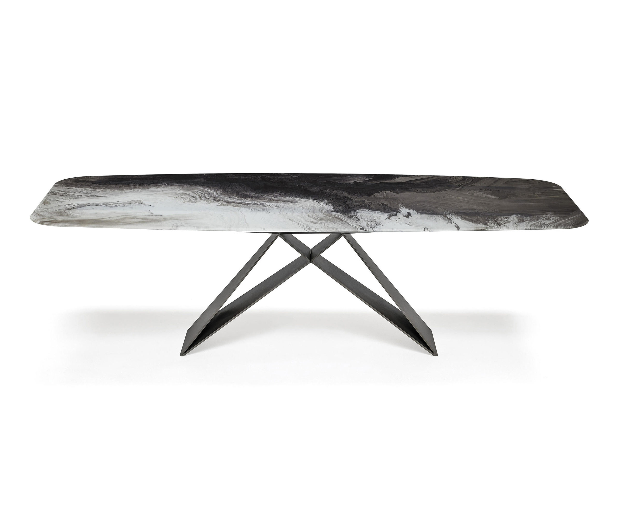 Extendible table with base in titanium (GFM11), bronze (GFM18), graphite (GFM69), black (GFM73) embossed lacquered steel, Brushed Bronze or Brushed Grey. Top and extensions in 12mm extra clear glass with artistic decorative printing in two different colours (CY01, CY02).