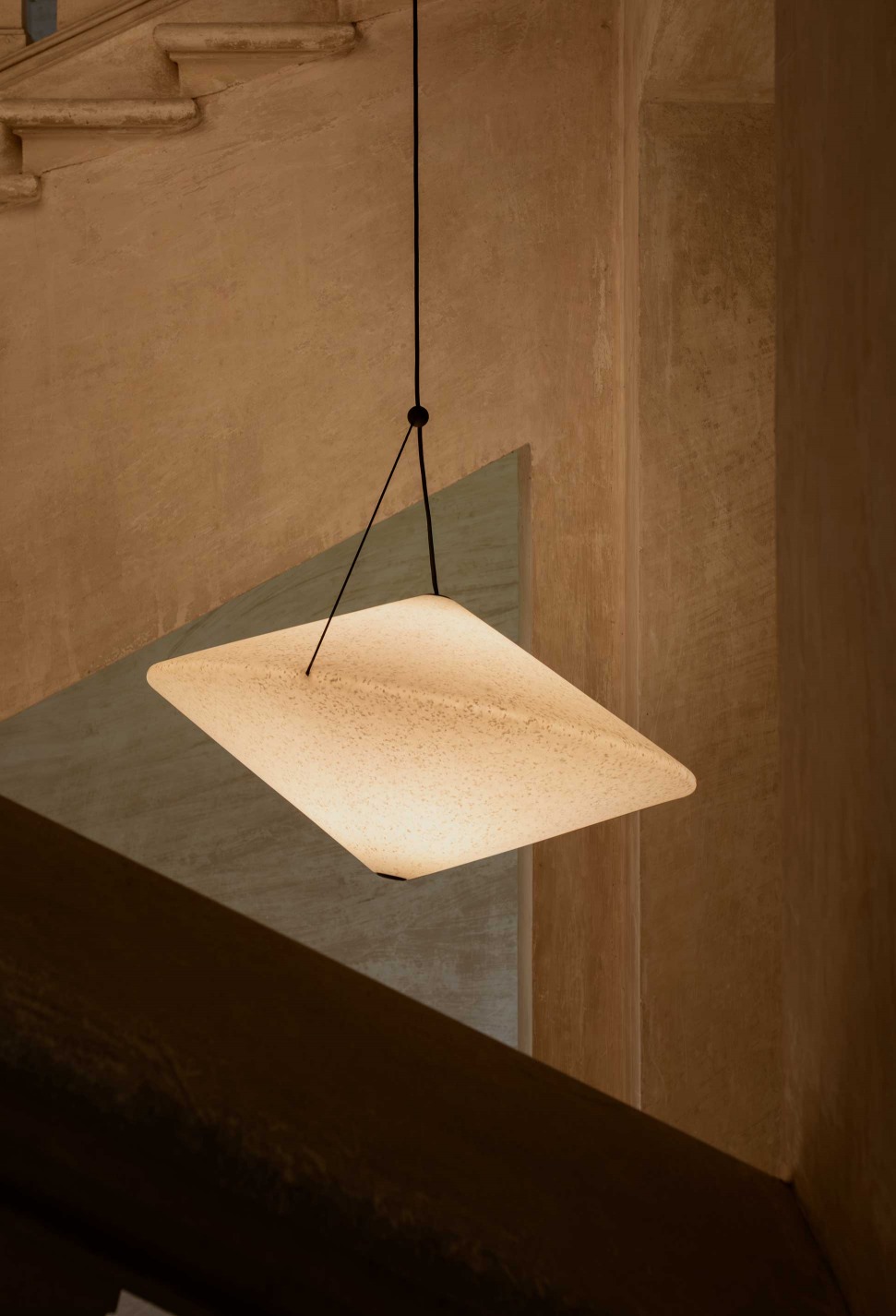 Miniforms Rificolona arrives hanging by a thread, to share a playful and creative spirit embodied by its materials: the shade, crafted mainly from recycled polyethylene, rotates in dialogue with the light, its density modified with a transparent spray. Rificolona delicately hovers over the elements in your living space, tilting according to necessity or the light desired at any given time of day.